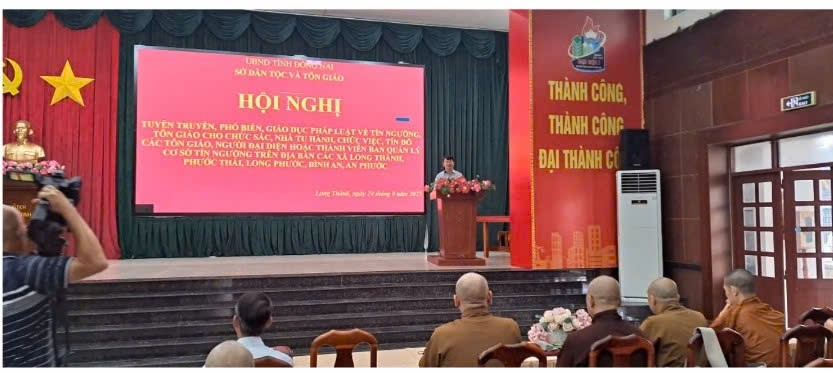 Ngày 24/9/2025, Sở Dân tộc và Tôn giáo chủ trì, phối hợp với UBND 05 xã (Long Thành, Phước Thái, Long Phước, Bình An, An Phước) đã tổ chức Hội nghị tuyên truyền, phổ biến, giáo dục cho chức sắc, chức việc, nhà tu hành, tín đồ các tôn giáo, người đại diện hoặc thành viên Ban Quản lý cơ sở tín ngưỡng tại Hội trường UBND xã Long Thành, tỉnh Đồng Nai.