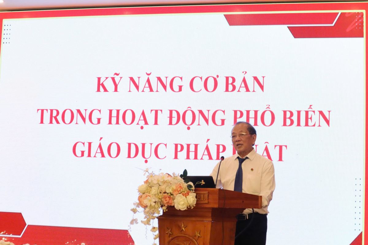 Báo cáo viên Phan Văn Châu – Chủ tịch Hội luật gia tỉnh triển khai kỹ năng tuyên truyền, phổ biến, giáo dục pháp luật. Đây là nội dung ý nghĩa quan trọng, tại Kết luận số 80-KL/TW ngày 20/6/2020 của Ban Bí thư Trung ương Đảng về tiếp tục thực hiện Chỉ thị số 32-CT/TW về tăng cường sự lãnh đạo của Đảng trong công tác phổ biến, giáo dục pháp luật, nâng cao ý thức chấp hành pháp luật của cán bộ, nhân dân đã khẳng định “Công tác phổ biến, giáo dục pháp luật là một bộ phận của công tác giáo dục chính trị, tư tưởng; là nhiệm vụ của cả hệ thống chính trị và toàn xã hội, đặt dưới sự lãnh đạo của Đảng”.